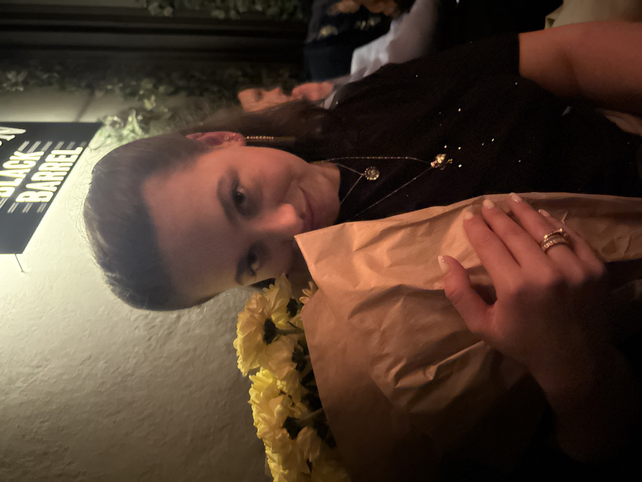 A woman smiles at the camera, holding a bouquet of yellow daisies wrapped in brown paper. She wears a black, sparkly top, gold earrings, and a delicate gold necklace. Gold rings adorn her right hand. Part of a "Black Barrel" sign is visible on the left. There are other people in the background.