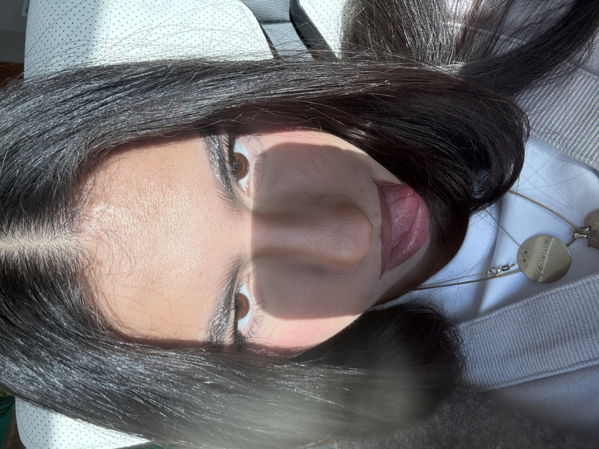 A close-up, rotated view presents a woman with long, dark hair against a blurred background of what appears to be a white leather surface and light grey fabric. Her face is bisected by a strong shadow, obscuring one side, revealing a light skin tone, brown eyes, and partially open mouth with her tongue slightly protruding. She is wearing a white garment, and a gold necklace with a round pendant is visible. The environment suggests an indoor setting, potentially within a car. No identifiable landmarks or elements connect the scene to Plovdiv, Bulgaria.