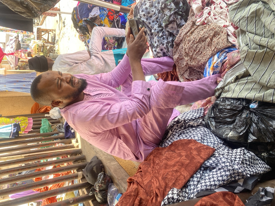 A market scene in Sabon Gari South, Nigeria, shows an individual seated amidst piles of clothing