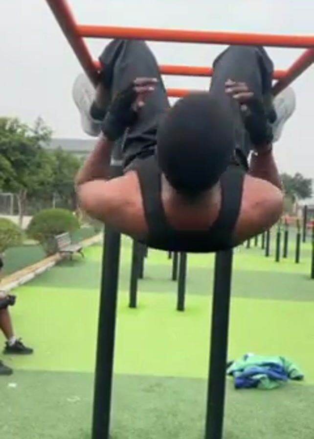 A man wearing black workout clothes and gray running shoes is hanging upside down from orange-painted monkey bars in an outdoor fitness park. The man has his hands laced behind his head. The man has dark skin and is wearing fingerless gloves. The park has a green artificial turf surface. A small bush and benches are visible in the background. Someone is seated in the distance to the left. A pile of light and dark blue clothing lays on the turf near one of the support posts of the monkey bars.