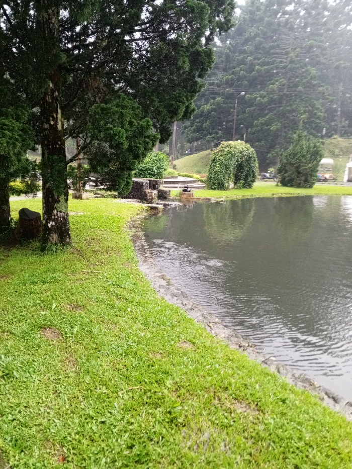 A serene pond edges a grassy bank, fringed by trees and vegetation. Raindrops create ripples on the water's surface. Beyond, a neatly trimmed arched bush and other shrubs adorn a slightly elevated area. Tall pine trees rise in the background, obscured by mist or rain, contributing to a tranquil, almost melancholic atmosphere. Evidence of structures, such as steps, suggests a park or landscaped setting.