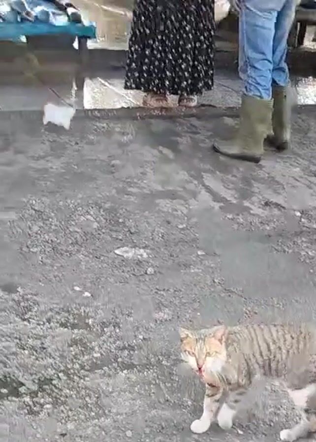 cat in an outdoor environment, possibly a fish market. The cat is a tabby, with gray and brown stripes and white paws. It is standing on a wet, gray surface, looking towards the camera. In the background, there are people standing near a table laden with fish. One person is wearing a long, black and white dress, while another is wearing blue jeans and green boots. The fish are laid out neatly on a table covered with a turquoise cloth. The environment appears to be a commercial area with potential for standing water, given the wet ground.