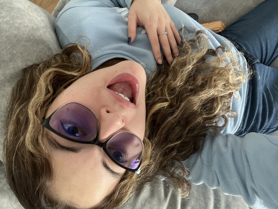 A single individual, appearing to be a female with light to medium skin tone and long, wavy, multi-toned brown hair, is depicted lying supine and looking directly into the camera. She wears black-framed glasses with purple-tinted lenses, and her mouth is open, revealing teeth and tongue. Her left hand, adorned with dark blue nail polish and a thin silver-colored ring on the ring finger, rests on her chest/upper torso. She is dressed in a light blue long-sleeved sweatshirt and dark blue denim jeans. The individual is positioned on a light grey upholstered surface, likely a sofa or bed, with a glimpse of a light brown, possibly wooden, floor visible in the bottom right corner. The scene is located in València, Spain.