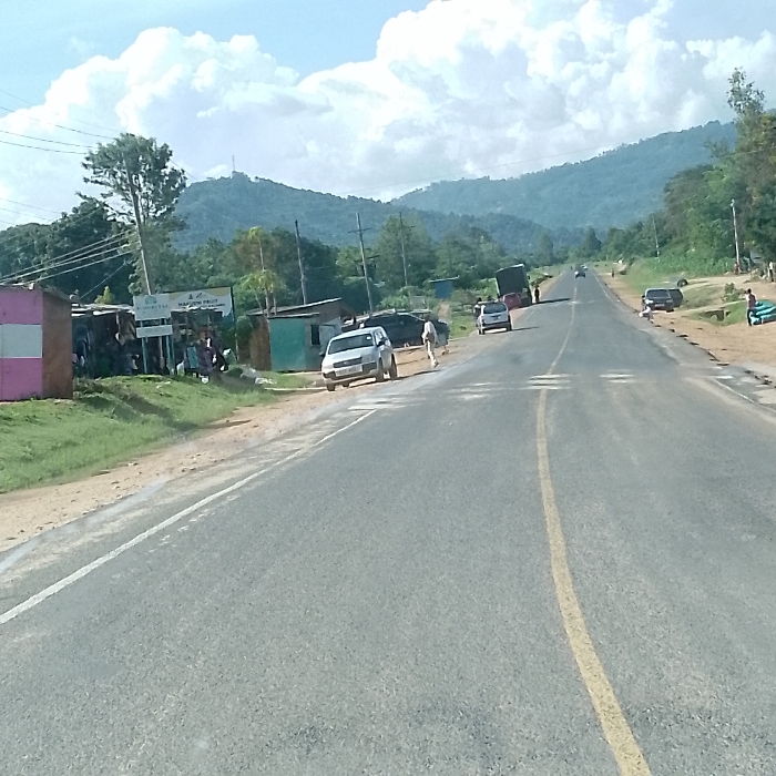 The image depicts a roadside scene in Kola ward, Kenya, under a clear sky with scattered cumulus clouds