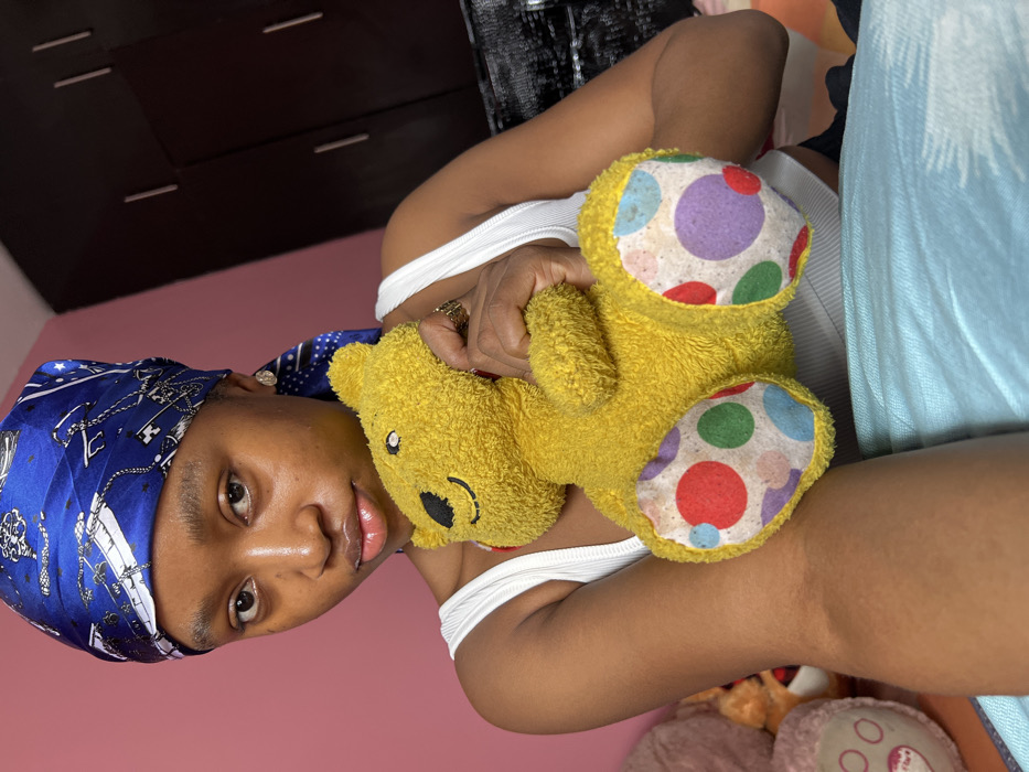 The image depicts a young female individual located indoors in Odo Ogun, Nigeria. She is positioned centrally, looking directly at the camera with a neutral expression. Her dark skin tone is visible, and she wears a blue satin headscarf featuring a white and silver chain/key pattern. She is dressed in a white ribbed tank top. A small, circular gold-colored earring is visible in her right ear, and a gold-toned ring is on the ring finger of her right hand. The individual holds a yellow plush teddy bear against her chest with both hands. The teddy bear has black stitched eyes and a black stitched smile. Its feet and possibly hand pads are made of white fabric patterned with red, green, blue, and purple polka dots. A thin red string or tag is partially visible around the teddy bear's neck. To the left of the frame, parts of other plush toys are visible, including a pink one with a heart design and a brown one. The background behind the individual features a solid light pink wall on the left side and dark brown wooden wardrobe or closet doors on the right. The individual appears to be seated on a surface covered by a light blue blanket or sheet with a faint, repeating pattern, likely indicating a bed.