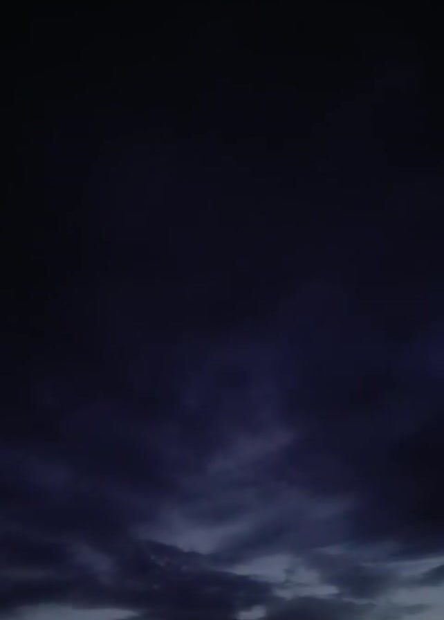 dark, cloudy sky, seemingly at dusk or dawn. The clouds are layered and textured, with varying shades of gray and blue. The top portion of the frame is predominantly dark, while the lower part reveals the cloud formations more clearly. The very bottom of the frame suggests a treeline or other low-lying objects.