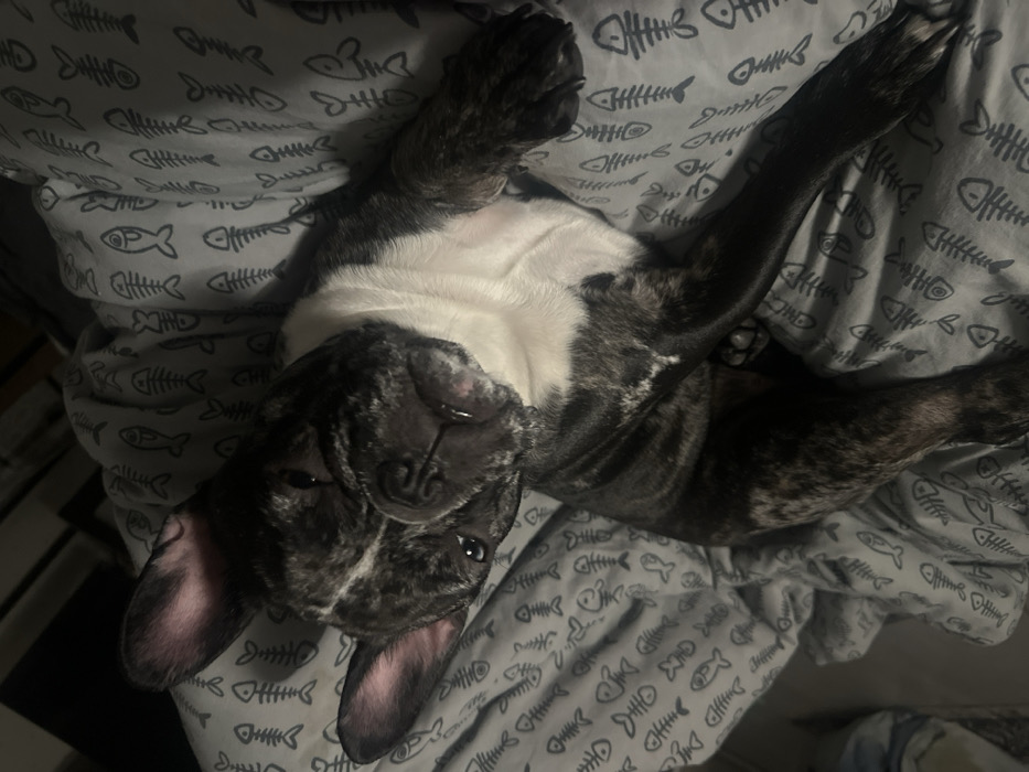 - "A brindle French Bulldog lies on its back on a gray bedsheet patterned with stylized fish skeletons" by FM-sJBub2, licensed under CC BY 4.0