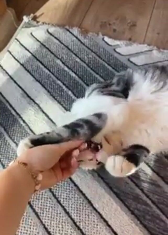A person's hand pets a gray and white cat lying on a gray and white striped rug on a wooden floor. The cat grabs and bites the person's hand playfully. The person wears a bracelet on their wrist. Sunlight illuminates the scene.