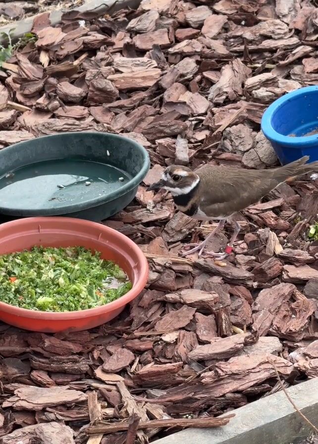 A bird with a white stripe above its eye, a brown body, and a black band around its neck is standing on wood chips near three shallow bowls of water and chopped vegetables. The bird repeatedly bobs its head and looks at the camera, and then it picks at the wood chips. The bowls are in a small bed next to a wooden frame.