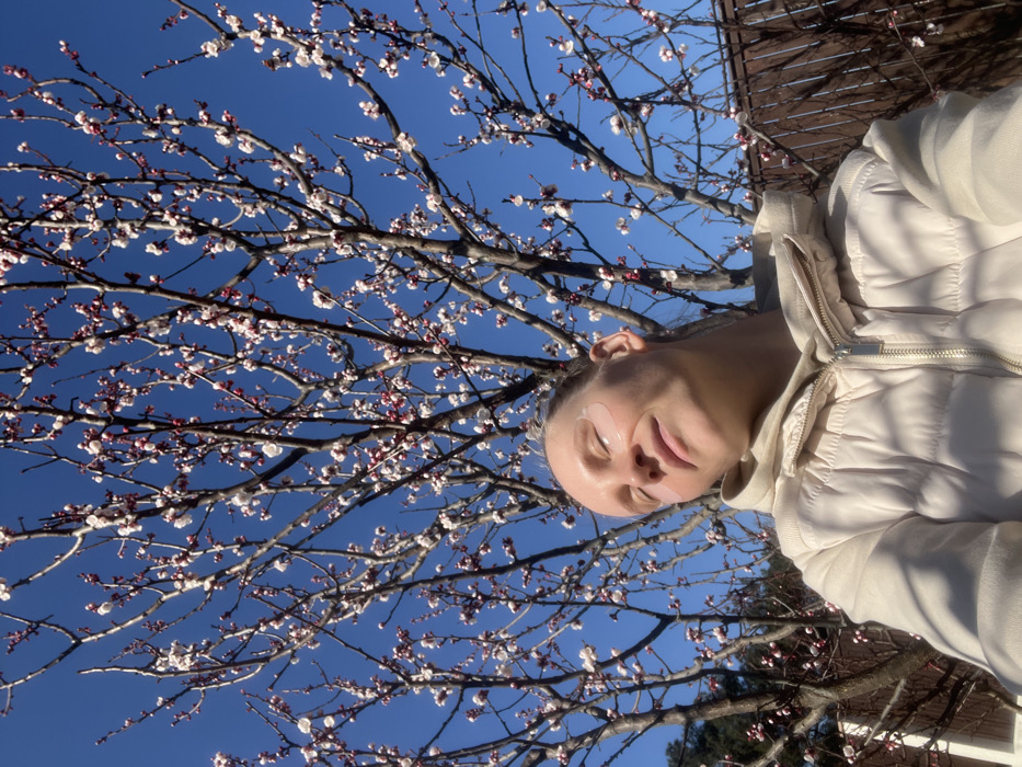 The image captures an outdoor scene in Gelendzhik, Russia, under a clear blue sky. A fair-skinned adult individual, appearing female, is positioned in the lower portion of the frame. Her eyes are closed, and her face is tilted upwards and slightly to the right, exposed to direct sunlight. Two translucent, light-colored under-eye patches are visible beneath her eyes. She is dressed in a light-colored, possibly cream or beige, quilted jacket worn over a hooded garment. The background is dominated by a deciduous tree with extensive branching, covered in numerous small white and pink blossoms, indicative of spring. A dark brown fence or wall is partially visible in the lower right background, behind the tree. Distant green foliage is discernible on the left side, further behind the blooming tree.