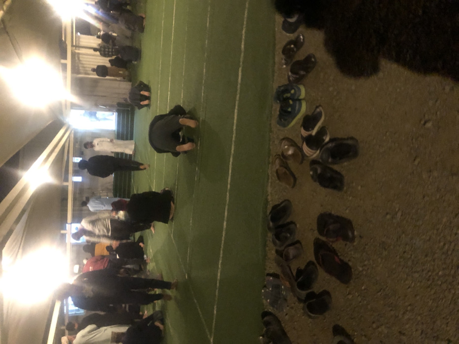 The image depicts an illuminated outdoor prayer gathering at night in النعيلة, Saudi Arabia. In the immediate foreground, numerous pairs of diverse footwear, including sandals and sneakers, are positioned on a sandy or unpaved ground surface. Adjacent to this, a green artificial turf area, delineated by white lines, hosts multiple adult males engaged in prayer. At least three individuals are prominently visible in the sujud (prostration) position, with their bare feet raised and faces directed towards the ground. Other men are seated or standing barefoot on the turf. The entire area is covered by a light-colored canopy structure, from which multiple bright artificial lights are suspended, illuminating the scene and causing lens flares. In the background, a structure with steps and light-colored walls is partially visible. The individuals are dressed in varied casual and traditional garments. No explicit interactions between individuals are observed, focusing on a collective religious activity.