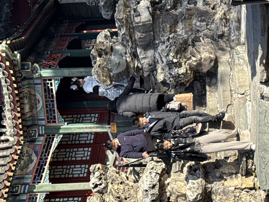 An outdoor scene depicts four people resting near traditional Chinese architecture and rock formations. One person is in traditional attire, possibly for a performance. The others appear to be staff or crew members, dressed in casual winter clothing. They are relaxing on what seems to be a terrace or elevated area, possibly between filming takes. The backdrop showcases intricate details of Chinese design, suggesting a historical or cultural site.
