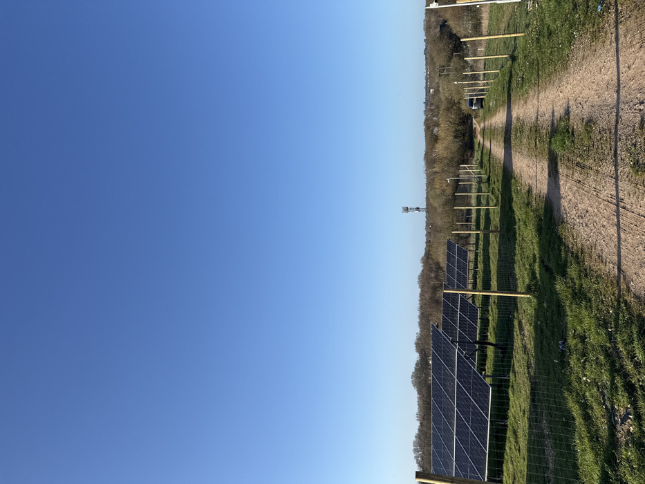 The image displays an outdoor scene located on the outskirts of Southampton, United Kingdom, under a clear, cloudless blue sky. A dirt track, exhibiting parallel tire impressions, extends from the bottom center of the frame into the mid-ground. On the left side of the track, a solar panel array consisting of multiple rows of dark, angled photovoltaic panels is installed in a grassy field. This array is bordered by a wire mesh fence supported by light-colored wooden posts, which also line the right side of the dirt track. Beyond the fencing on both sides, green grass transitions into denser vegetation, including deciduous trees and bushes, forming a treeline across the mid-ground. A dark-colored vehicle, consistent with a van or SUV, is parked at the visible end of the dirt track in the mid-ground, partially obscured by the track's perspective. In the background, a tall, slender cellular communications tower, equipped with multiple antennae, stands prominently against the clear sky, positioned to the right of the image's vertical center. Faint indications of distant structures are visible beyond the treeline. No individuals are present in the depicted scene.
