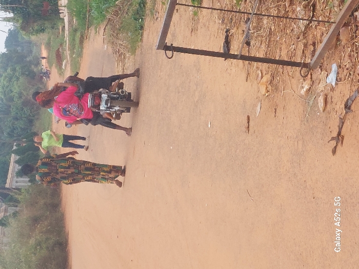 This image depicts an unpaved, reddish-brown dirt road in Umudioka, Nigeria, under diffused daylight conditions