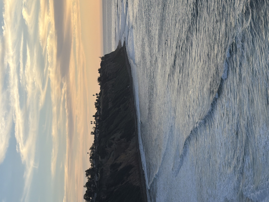 A coastal view shows a cliff line densely populated with trees and buildings. The ocean, exhibiting fine wave patterns, stretches along the right side. Above, a sky transitions from pale blue to hues of orange and gray, filled with wispy cloud formations. The scene presents a natural landscape infused with subtle human presence.