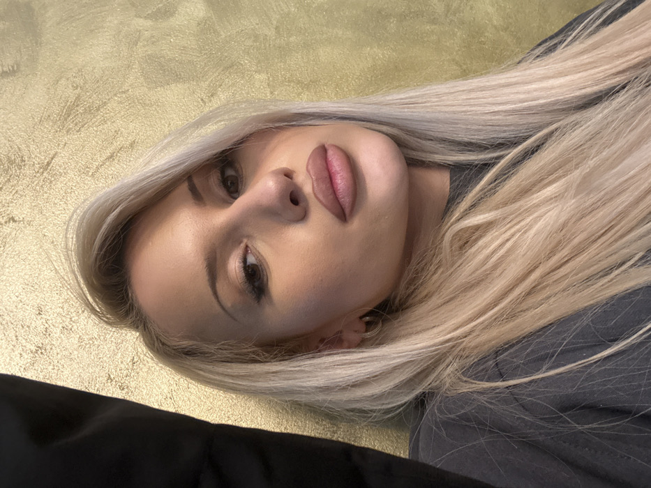 The image displays a close-up portrait of a female subject, positioned against a textured, golden-colored wall. The subject has long, straight blonde hair, styled to her right, and brown eyes with prominent dark eyeliner. Her eyebrows are defined, and her lips appear full. Small, circular hoop earrings are visible in her left ear. She is wearing a dark, possibly grey, casual garment, with a dark, unidentifiable object partially obscuring the background on the far left. The subject's head is tilted slightly to her right, and she is looking directly at the camera. The scene is situated indoors, in the city of Plovdiv, Bulgaria.