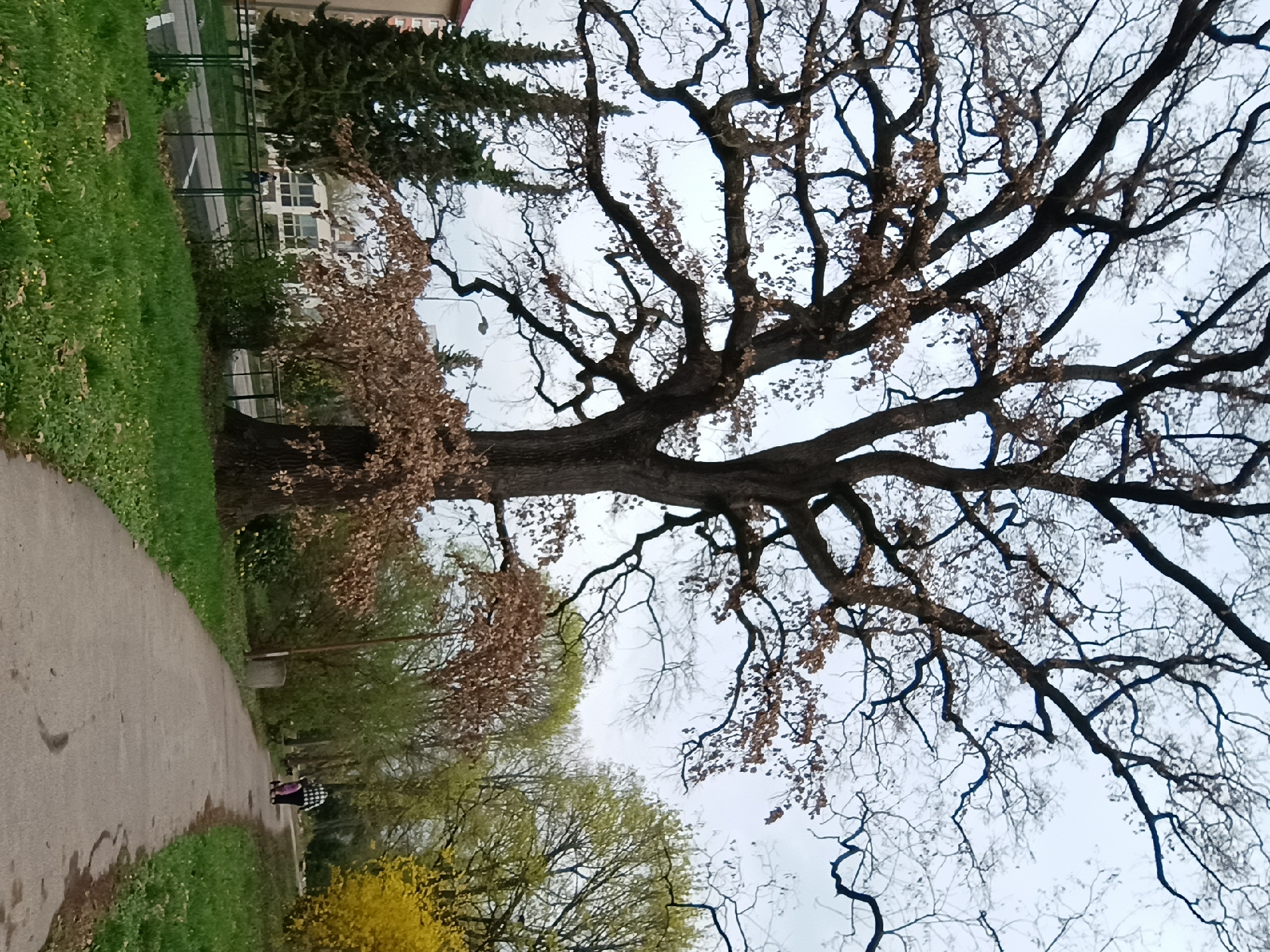 park scene in Levice, Slovakia. A paved pathway curves into the distance. Lush green grass lines the left side of the path. On the right, a large deciduous tree dominates the view. It has thick, dark branches reaching towards a grey sky. Some of the tree's leaves are brown, suggesting early spring or late autumn. Further along the path are other trees; some with yellow blossoms and others with fresh green leaves. A building is visible behind a green fence in the background. Two people walk along the path in the middle distance.