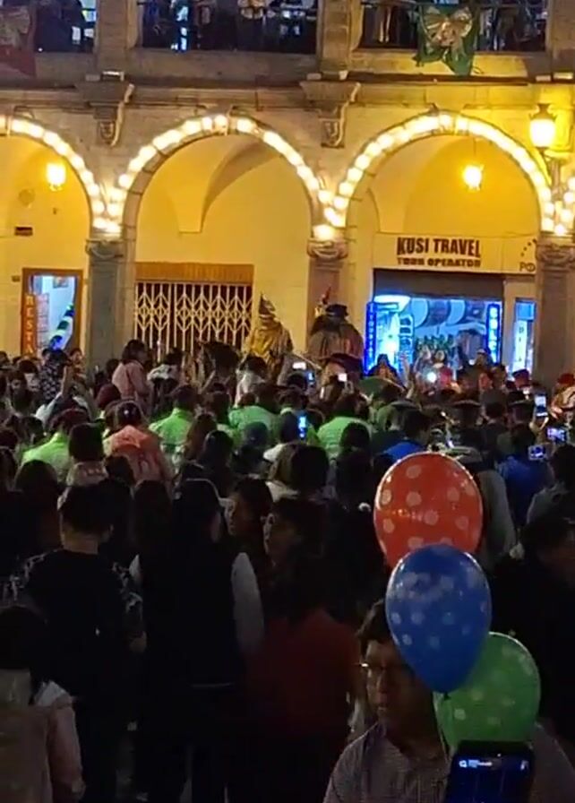 large crowd of people gathered in a city square at night, many of whom are holding up their phones to record something happening in front of them. In the center of the crowd, three people dressed in elaborate costumes are visible. Behind the crowd and costumes are arched buildings illuminated with lights. Above, on the balconies of these buildings, more people are watching the events below. Balloons in colors such as red, blue, and green can be seen floating in the crowd. A sign for "Kusi Travel - Tour Operator" is visible in one of the buildings, indicating the location may be a tourist area.