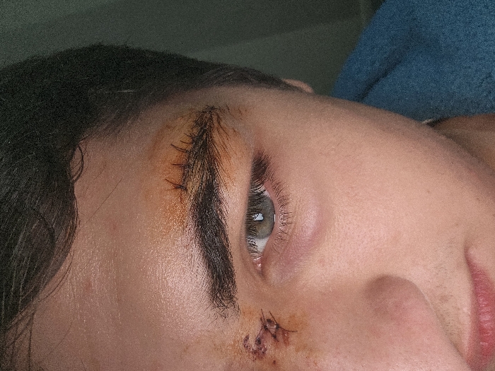 The image displays a close-up, partial view of a person's face, focusing on the left eye and forehead area. The individual has dark hair and a light-colored iris in the visible eye. A laceration above the left eyebrow is closed with approximately six black sutures. The skin around this wound, and within the eyebrow hairs, exhibits an orange-brown discoloration consistent with an antiseptic solution. A smaller, irregularly shaped laceration, closed with two visible black sutures, is present superior to the inner corner of the left eye, also showing antiseptic staining. Substantial swelling and purplish discoloration are visible beneath the left eye, indicative of a contusion. A portion of a textured blue garment is visible on the right side of the frame. The background is indistinct and dark. The specific location in the city of Tbilisi, Georgia, cannot be determined from the visual information provided.