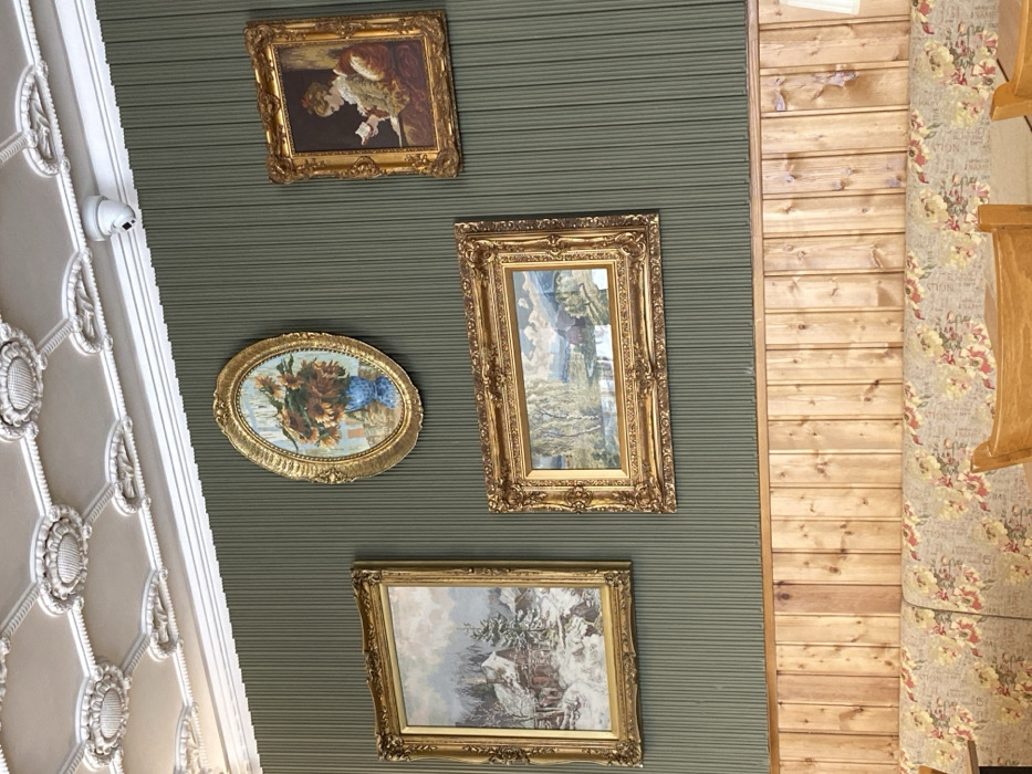 This image depicts an interior scene, specifically a wall within a commercial establishment in Gabrovo, Bulgaria. The upper section of the wall features olive-green, vertically ribbed wallpaper or paneling. The lower section consists of light natural-toned wood paneling, approximately one-third of the wall's height. Four framed artworks with ornate gold frames are mounted on the olive-green wall: 1. Top center: An oval-framed painting depicting sunflowers in a blue vase. 2. Top right: A rectangular-framed painting of a woman in historical attire, seated and reading a letter. 3. Middle left: A rectangular-framed landscape painting portraying a snow-covered village with houses and trees. 4. Bottom center: A horizontal rectangular-framed landscape painting showing a river or stream flowing through an area with trees and distant hills or mountains. Mounted near the ceiling, above the oval painting, is a white dome-shaped security camera. The ceiling is white and features ornate coffered panels with decorative circular rosettes. In the foreground, a section of a long booth or bench is visible, upholstered with a beige fabric featuring a repeating floral pattern of red, yellow, and green flowers and leaves. A portion of a light wooden chair back is visible at the bottom right of the frame, suggesting the presence of dining furniture. No individuals are present in the image.