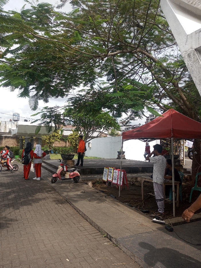 A group of people occupies an outdoor area. Some individuals stand near scooters, while others are under a red tent. One person is wearing an orange shirt. Trees provide shade, and a building is visible in the background. A pathway leads through the scene. There are multiple scooters in the frame, mostly near the side of the building. There also seems to be some type of table/booth under the tent.