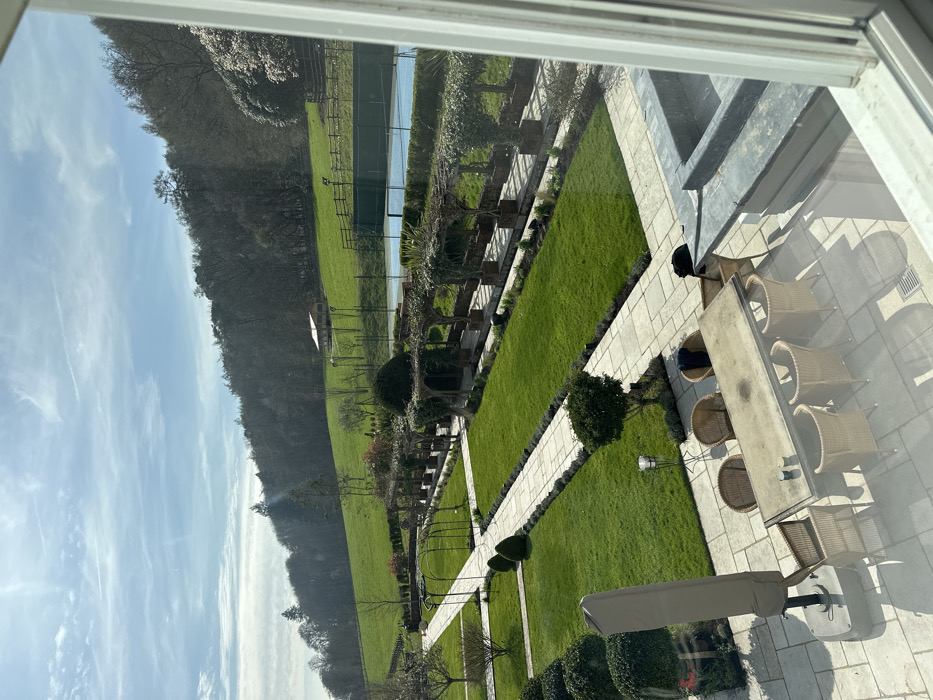 This image, captured from an elevated interior perspective, depicts an expansive outdoor scene in Waverley, United Kingdom. The foreground features a light-colored paved patio with a large rectangular outdoor dining table surrounded by eight wicker chairs. A beige umbrella, collapsed and covered, is positioned on the left, next to a planter with red flowers. A tall, thin metal stand with a bucket is situated near the table. A dark fabric item is draped over a chair, and a small, dark, possibly feline creature is partially visible on the patio near the building's edge. A dark grey architectural element is visible on the far right. Beyond the patio, a formally landscaped garden extends, characterized by manicured green lawns segmented by light-toned paved pathways. Rows of trimmed hedges and ornamental shrubs are systematically arranged. An elongated pergola, adorned with climbing plants, runs horizontally across the garden, paralleling another paved path with arched trellises further back. In the mid-distance, on a higher grassy terrace, a blue tennis court with white lines and a green perimeter fence is visible. Several floodlight poles surround the court. A small, light-colored building or structure is situated on the grassy slope behind the tennis court. The background consists of a steep, tree-covered hillside, featuring a mix of bare deciduous and evergreen trees, with a large flowering tree showing white blossoms on the right side. The sky above is partially cloudy with visible sunlight. No people are present in the scene.