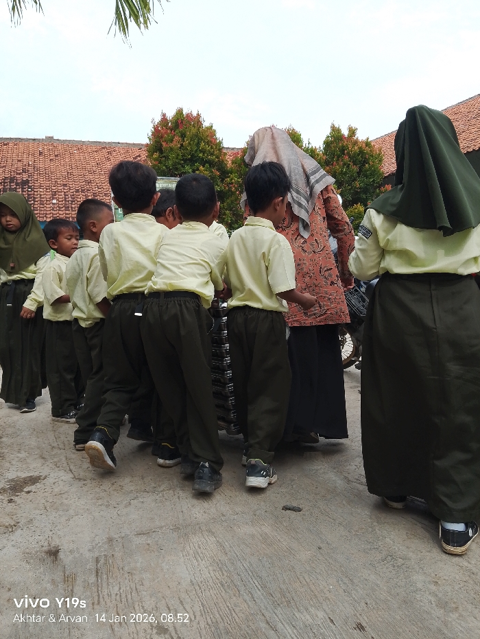 A group of young children in light yellow shirts and dark green pants line up, facing away from the camera. Most have short hair. They appear to be holding onto a dark object with multiple slats. Two women in headscarves and long skirts stand with them, one in green and the other in a printed fabric. The group stands on a concrete surface in an outdoor setting, with buildings and greenery visible in the background. A motorcycle is parked nearby.