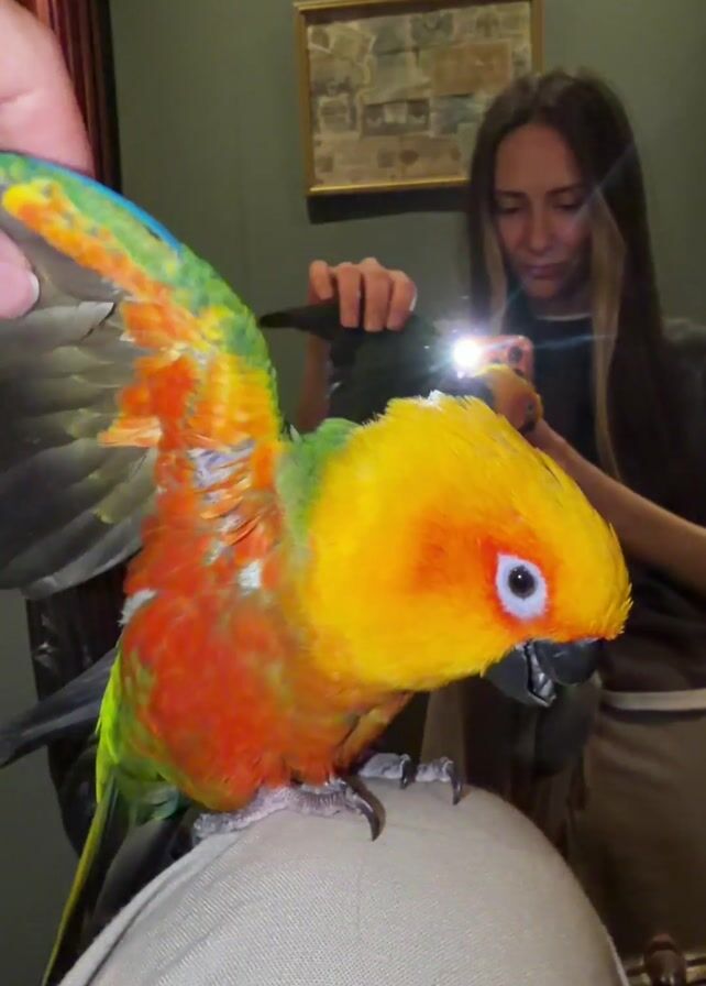 A close-up shot shows a colorful parrot perched on someone’s knee with its wings partially extended. The parrot has a bright yellow head, orange and green body, and gray wings. A woman with long hair is in the background, slightly out of focus, holding a phone and appearing to take a picture or video of the parrot. The environment appears to be indoors, with a dark green wall, a framed picture, and a dark wooden doorway visible. The scene is well-lit, emphasizing the parrot’s vibrant colors.