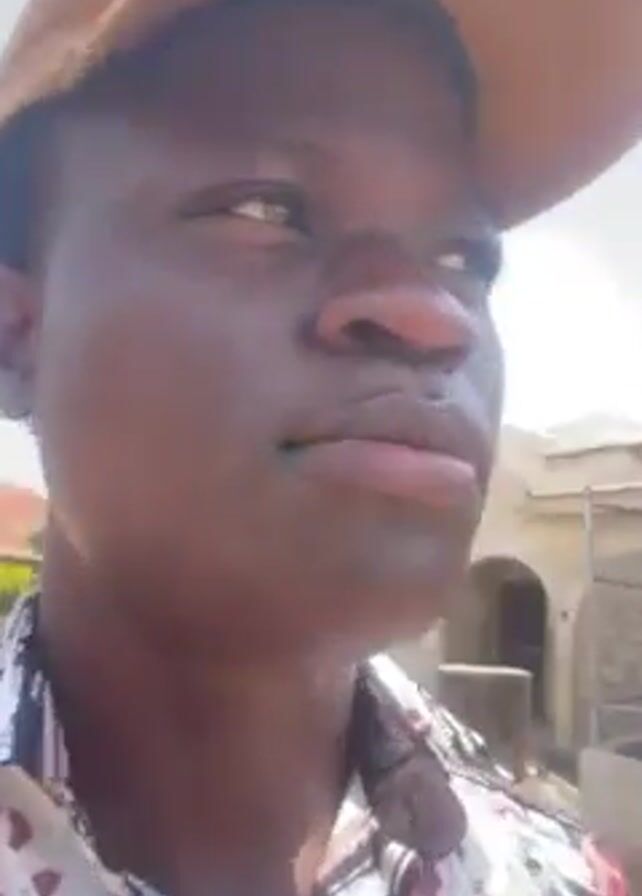 A young, dark-skinned man is filming himself outdoors. He is wearing a patterned shirt and a tan baseball cap with an emblem on the front. He is standing on a sandy path, with buildings visible in the background. He mentions he is heading to the beach.