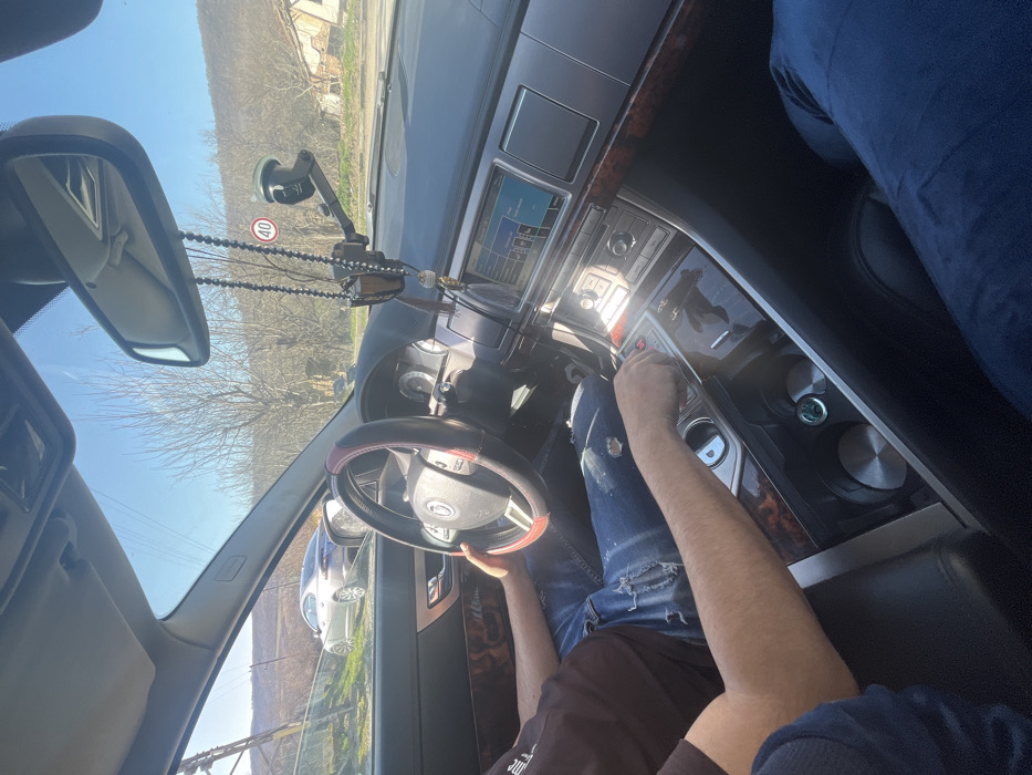 The image depicts the interior of a Jaguar XF automobile, specifically from the perspective of a front passenger, in Rodina, Bulgaria. The driver, wearing a dark t-shirt and ripped blue jeans, is visible with their left hand on the steering wheel, which has a red and black cover, and their right hand resting on the rotary gear selector dial on the center console. A second individual, likely a front passenger, is partially visible to the right, wearing dark blue trousers. The car's interior features a dark dashboard, an infotainment screen displaying a user interface, and wood-grain trim on the doors and center console. Sun glare is evident across the center console. A black beaded rosary or similar decorative chain, along with another small adornment, hangs from the rearview mirror. A black suction-cup mount is affixed to the windshield on the passenger side. Through the windshield, a bright, clear blue sky is visible. The exterior environment features bare deciduous trees, indicating a cool season, and distant hills. A power line structure is visible to the left. A silver sedan, resembling a Jaguar XF, is parked or moving on a dirt track or shoulder to the left of the road. On the right side of the road, a circular speed limit sign displaying "40" is visible, along with a partially dilapidated, light-colored building with a brown roof.