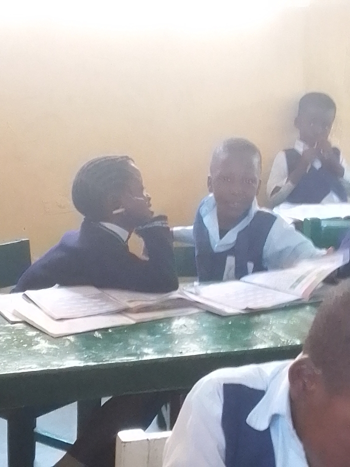 three young students sitting at a green table inside a classroom. The student on the left is wearing a blue uniform jacket and has their chin resting on their hand. They are facing away from the camera. The student in the middle is wearing a light blue and black collared shirt and has a book in front of them. They are looking at the camera with a serious expression. The student on the right is partially out of frame, they are wearing a blue and white collared shirt and are looking down. There are books and papers on the table. The classroom appears to be brightly lit. The location of the classroom is Unknown, Unknown.