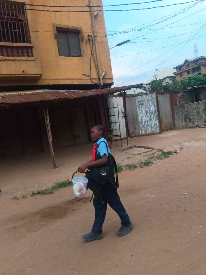 A young boy in a blue uniform and red tie walks along a dirt road. He carries a backpack and a transparent bucket containing colorful items. He walks past a building with a rusty awning and a gated entrance. Overhead wires crisscross the sky. Other buildings are visible in the background, with some greenery. The lighting suggests it's daytime.