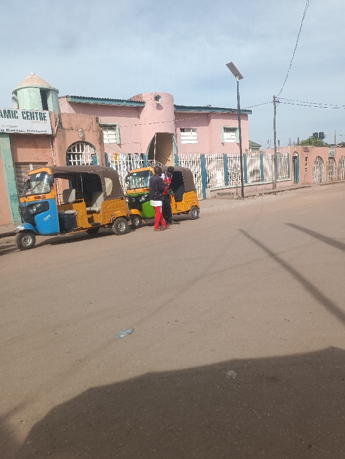 The scene is set on a paved road in Ungwan Liman, Nigeria, under a partly cloudy sky. On the left, a light brown building identified by a sign as an "ISLAMIC CENTRE" features a teal dome and arched windows. Adjoining it, a two-story pink building with a green corrugated roof and an arched entrance is visible, fronted by a pink fence with white vertical bars. Three auto-rickshaws are parked parallel to the curb: a blue and tan model marked "023M", a green and tan model, and a yellow and tan model. Three male individuals are positioned between the green and yellow auto-rickshaws, appearing to interact. One individual wears a dark jacket over a red top and red pants; another wears a dark top over a green shirt and dark pants. A black pole with a solar panel and integrated light fixture stands on the right side of the road. Overhead utility lines traverse the upper portion of the frame. The asphalt road surface is visible, with a small piece of blue debris in the foreground and shadows extending across the pavement from the left.