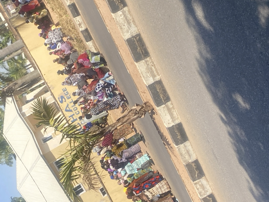 The image depicts an outdoor scene in Barakin Lerawi, Nigeria, on what appears to be a clear, sunny day. A large congregation of individuals, predominantly women, is gathered along the roadside. **Location and Environment:** The scene is situated alongside an asphalt road with a curb marked by alternating black and white segments. Beyond the curb is a dirt verge. In the background, a two-story building with a light yellow-cream facade and a light-colored corrugated metal roof is visible. Large, dark blue letters on the building's exterior clearly display "HAS COLLEGE." Partially visible text above "HAS COLLEGE" suggests a longer institutional name. Several palm trees are present; one with a slender trunk and green fronds stands prominently in the mid-ground, partially obscuring the crowd, while others are visible behind the building. Shadows from unseen objects and the visible palm tree are cast across the asphalt road, indicating a high sun angle. **People, Subjects, and Actions:** A dense crowd of numerous individuals, estimated to be over fifty, is positioned along the dirt verge, parallel to the road and adjacent to the building. The majority are women, dressed in diverse, brightly colored and patterned traditional Nigerian attire, consisting primarily of long dresses and head wraps. Many are depicted in seated or stooping positions on the ground, while others stand within the gathering. Their collective posture suggests a waiting or static assembly. No explicit interactions between individuals are discernible, nor are any clear activities or actions beyond their collective presence. No visible objects are being actively used or carried by the individuals, apart from their clothing.