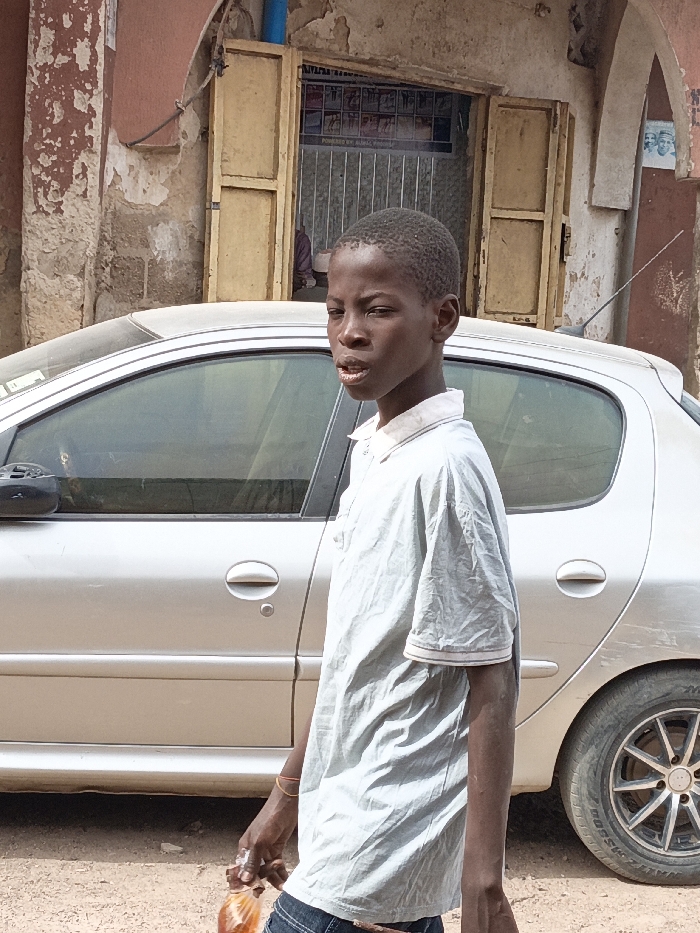 A young male is depicted in a daytime street scene in Gwagwarwa, Nigeria