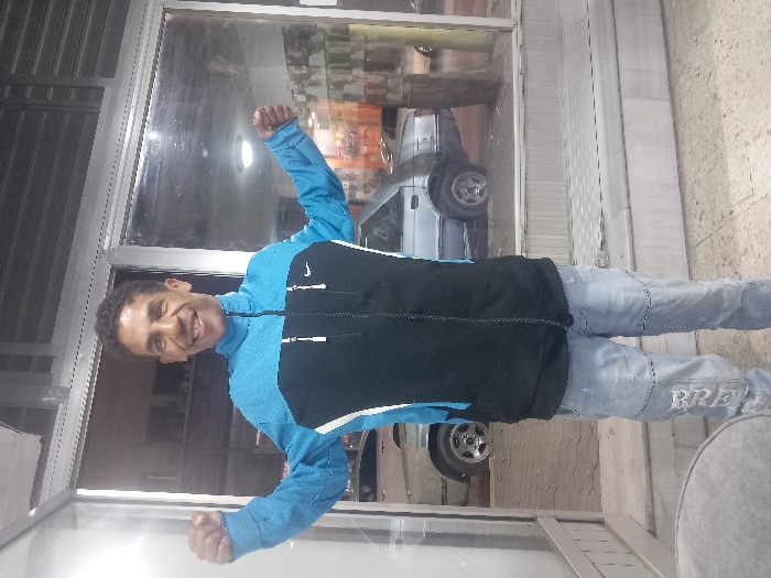 An adult male stands indoors, centrally positioned, in front of a large glass window overlooking an urban street scene in Munin, Syria. The male, with dark, curly hair and a mustache, is smiling directly at the viewer. He is wearing a long-sleeved jacket, light blue across the shoulders and upper chest, with a black body and lower sleeves, featuring a white horizontal stripe and a white Nike swoosh on the left chest. He wears light blue, distressed denim jeans with visible stitching and partially legible text on the left leg. Both of his arms are bent at the elbows, with fists clenched and raised to shoulder height. The indoor environment includes a light-colored tiled floor and a partial view of a grey upholstered object in the lower left foreground. A raised step or platform is visible behind the subject, leading to the window. The window frame appears to be constructed of metallic material. Through the window, an outdoor street or parking area is visible under artificial illumination, indicative of dusk or nighttime. Two light-colored, older model sedans are parked on the street, and a tree trunk is situated between them. Reflections on the glass obscure some background details, but a distinct circular light source is visible through the window on the right side.