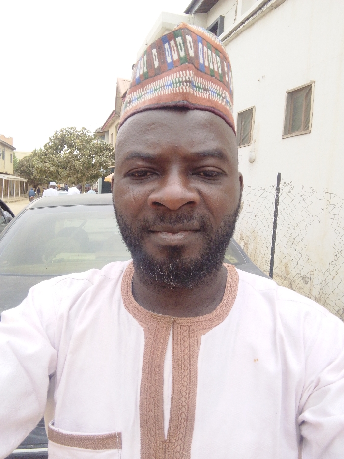 A dark-skinned adult male is depicted in a head-and-shoulders portrait, centered and facing directly towards the camera. He has a short black beard with some graying and a visible scar on his left cheek. He wears a white, long-sleeved tunic with brown embroidered trim around the neckline and extending down the chest, and a brown trimmed pocket on the left chest. A patterned traditional cap, predominantly brown with blue, white, and red geometric designs, is on his head. The scene is located in Hotoro South, Nigeria. In the background, behind the subject, a dark-colored vehicle's roof and rear window are partially visible. To the left, a street or road extends into the distance, with several indistinct individuals, some wearing white head coverings, and a large tree with green foliage. Buildings with light-colored facades and traditional roofs line this street. To the right of the subject, a white-painted building featuring two rectangular, wood-framed windows and a flat roof section is visible, partially obscured by a section of chain-link fencing. The sky is bright and overcast, indicating daytime.