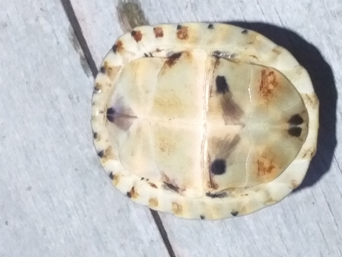 The image presents a close-up, overhead view of the ventral side (plastron) of a turtle, positioned upside down
