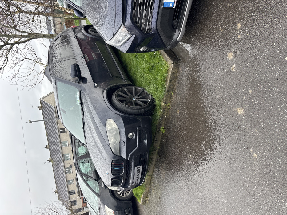 The image depicts an outdoor, overcast, daytime scene in County Kerry, Ireland, consistent with vehicle registration details, within the general area of Listowel as per the prompt's context. The ground consists of wet, dark asphalt pavement in the foreground, indicating recent precipitation. A concrete curb separates the pavement from a raised, green grassy verge. Three vehicles are visible: 1. **Center-left:** A black BMW X5 SUV (registration "09 LK 12227," indicating County Kerry) is parked with its front right wheel and a portion of its front left wheel on the grassy verge, over the curb. The vehicle has dark multi-spoke alloy wheels, and its front grille features red, light blue, and dark blue accent strips. A document is visible on the dashboard under the windshield. The vehicle's surfaces are wet with visible water droplets. 2. **Far left:** Partially visible behind the BMW X5 is a dark-colored Citroën Picasso, showing its front passenger side and wheel. 3. **Far right:** Partially visible, a dark blue Toyota RAV4 is parked closely to the right of the BMW X5. Its front bumper, grille, headlights, and a partially visible Irish license plate are discernible. This vehicle's surfaces are also wet. In the background, behind the vehicles and verge, are several bare deciduous trees, suggesting autumn or winter. A row of residential houses with light-colored facades and dark roofs is visible beyond the trees. A utility pole stands between the houses and trees. No people are present in the scene. The overall impression is a suburban or residential street on a damp day.