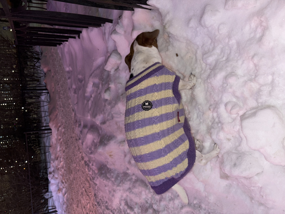 - "A Jack Russell Terrier wearing a purple and tan striped sweater lies in the snow next to a railing" by FM-vbcjb2, licensed under CC BY 4.0