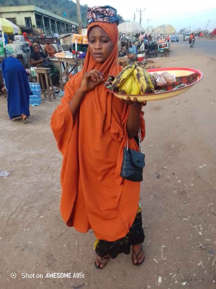 - "A young woman stands on a dirt road shoulder in Lokoja, Nigeria, holding a large, yellow-rimmed metal tray in her left hand" by FM-WxR0k2, licensed under CC BY 4.0