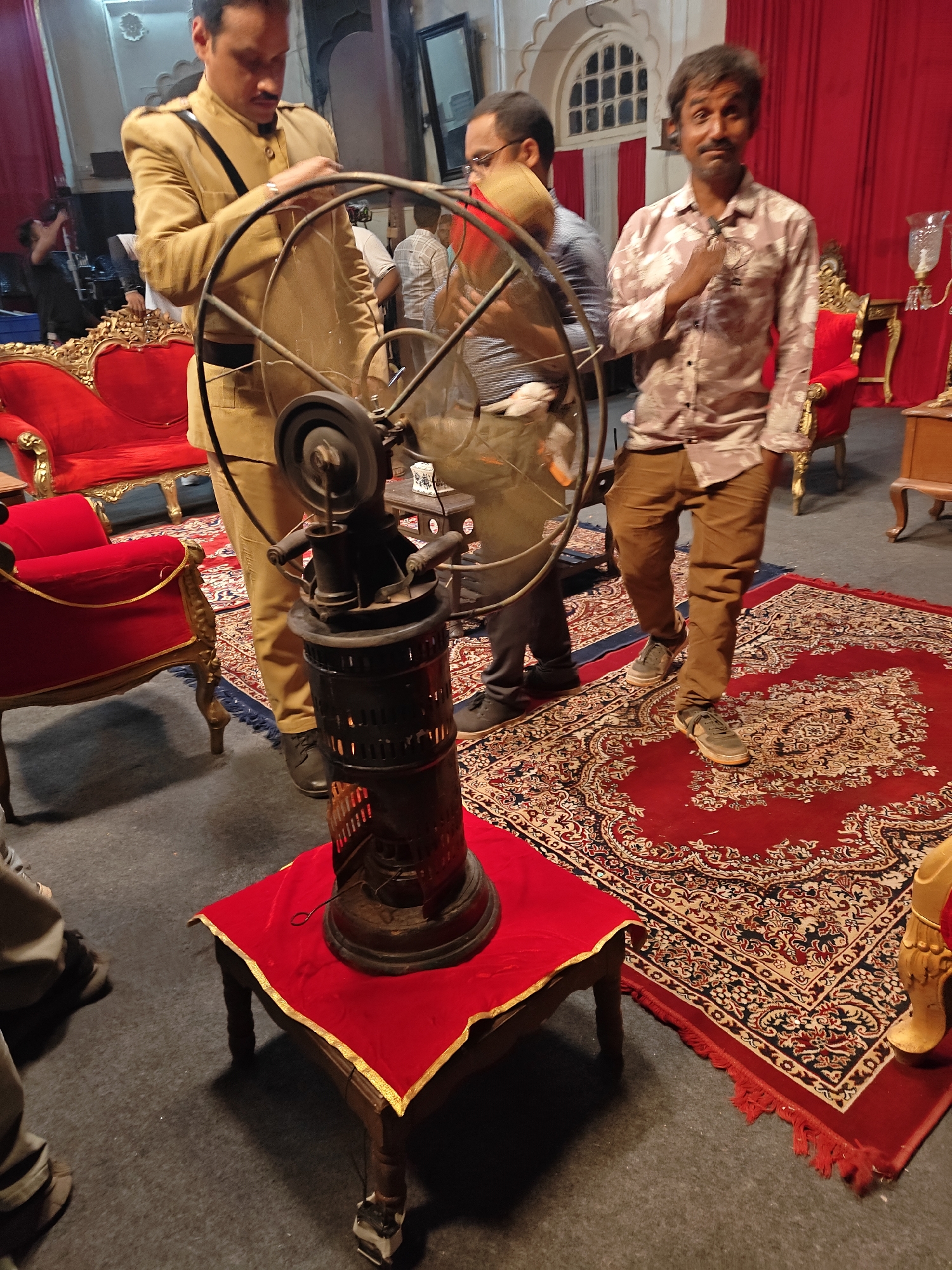 The image captures an indoor scene in what appears to be a studio or film set in Kolhapur, India. The room features a dark gray floor partly covered by a large, ornate red rug. Several red and gold armchairs are scattered around, along with an antique-style fan on a small table covered in red fabric with gold trim. Three men are the primary subjects. One is dressed in a khaki-colored uniform, standing near the fan. Another man wears a light-colored patterned shirt and brown trousers, standing to the side with his hand raised near his chest. A third man, partially obscured, stands between them. Red curtains are in the background, and an arched window is visible in the upper right. Lighting and filming equipment are visible on the left. The vintage-style fan is the focal point. The room evokes a historical or theatrical setting.