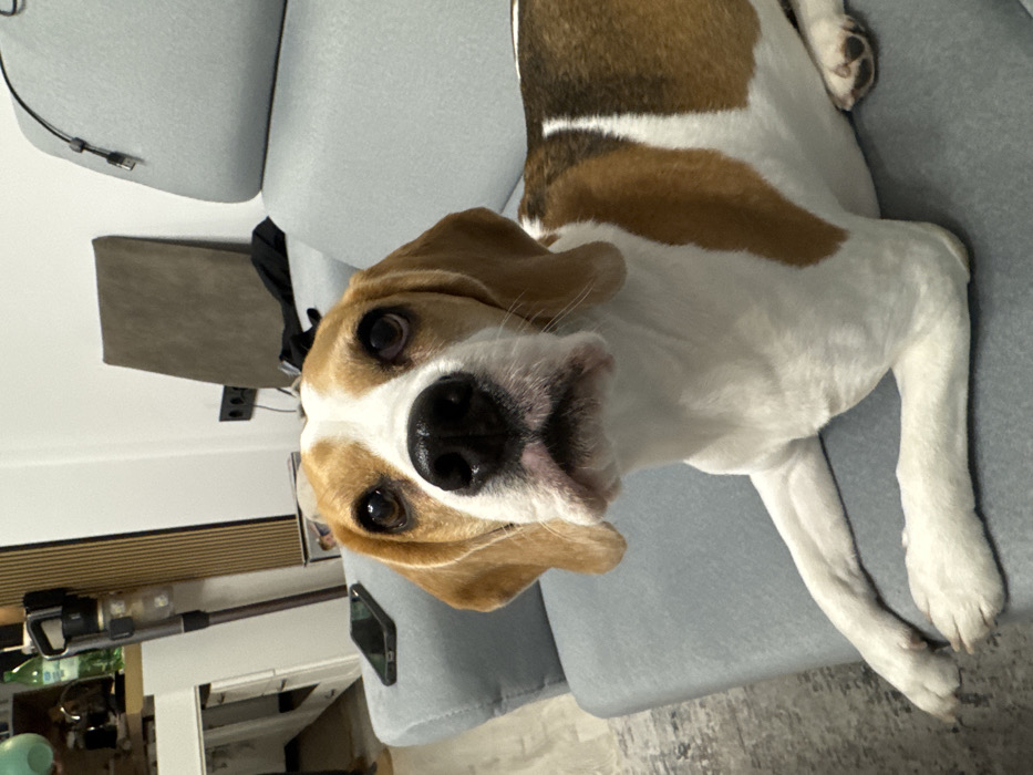 - "A tricolor Beagle dog, characterized by white fur on its chest, legs, and a facial stripe, alongside brown/tan patches on its head, ears, and back, is positioned on a light blue-grey upholstered sofa" by FM-98i2Y2, licensed under CC BY 4.0