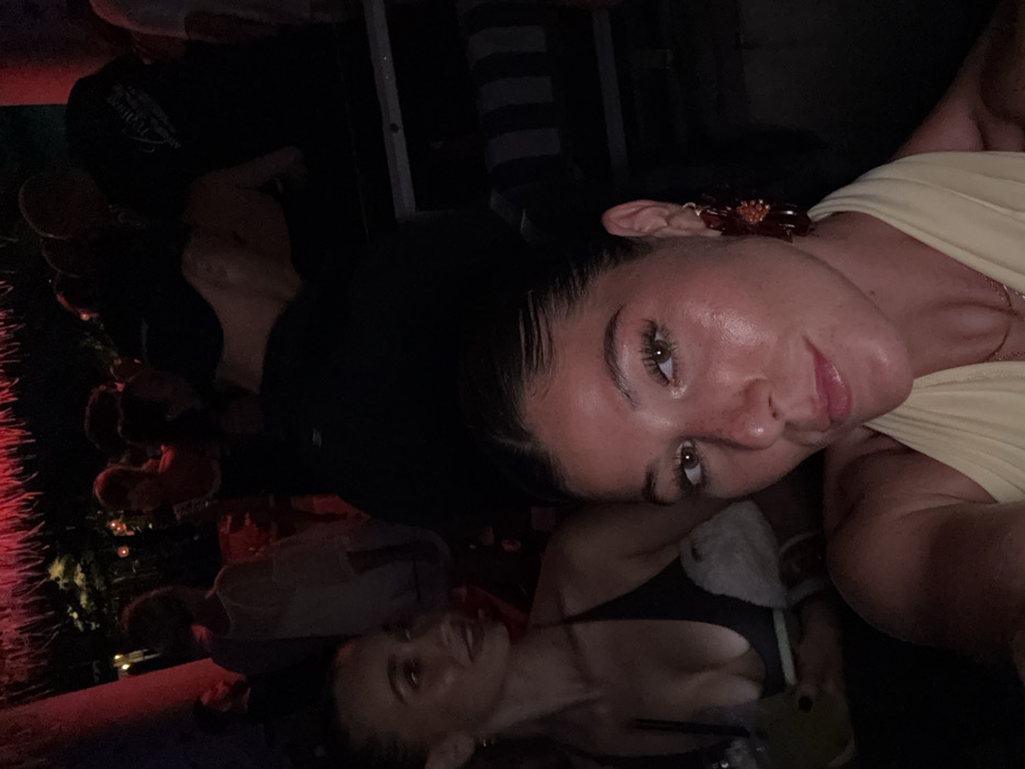 The image depicts an indoor or semi-enclosed bar or nightclub environment in Pecatu, Indonesia, characterized by dim lighting with a strong red ambient hue originating from an overhead thatched structure. In the foreground, a female subject with dark hair pulled back, wearing a light-colored halter-neck top and a large, multi-layered brown/red floral earring on her right ear, looks directly at the camera with a subtle smile. Her skin exhibits a reflective sheen. Positioned to her left and slightly behind, a second female subject is visible in profile, wearing a dark top, holding a clear glass containing a light beverage with a straw, and looking towards her right with a faint smile. The background contains numerous indistinct figures, largely obscured by darkness and motion blur, indicating a crowded setting. One figure in the upper right wears a dark shirt with light lettering. A dark speaker or equipment case with horizontal striped detailing is visible behind the two foreground subjects.
