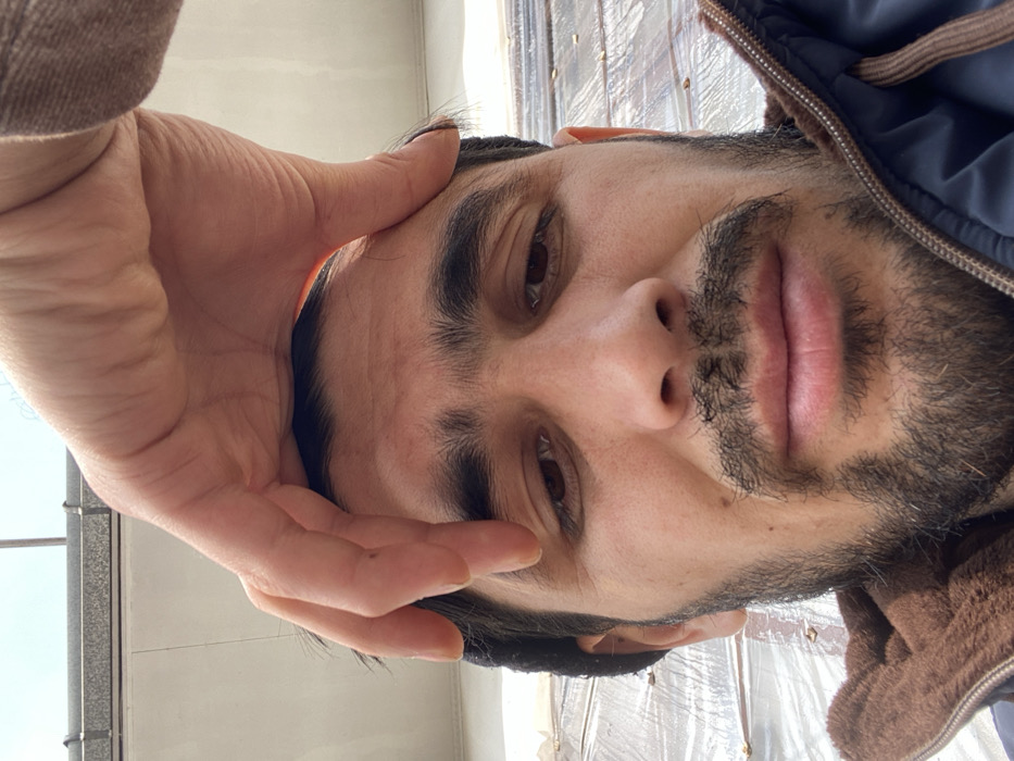 A close-up, slightly angled selfie shows a man with dark hair, eyebrows, and a patchy beard