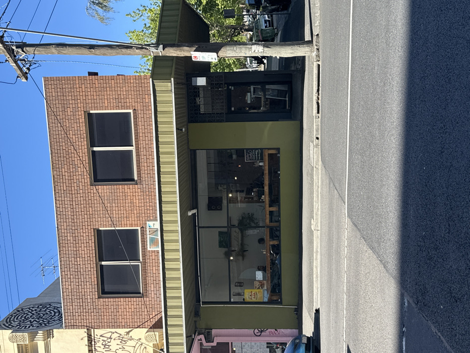 This image depicts a two-story commercial building on a sunny day, located on a street corner in Fitzroy, Australia