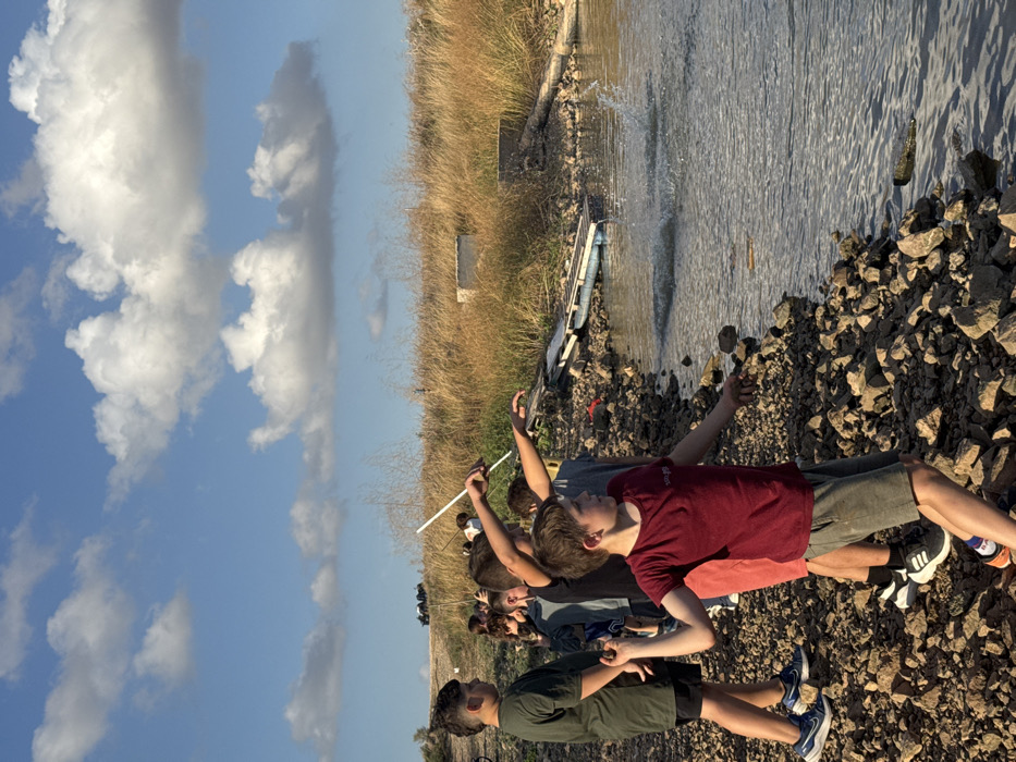 The image depicts an outdoor scene at the Gilboa Regional Council, Israel, focusing on a group of approximately ten young males gathered along a rocky shoreline of a body of water