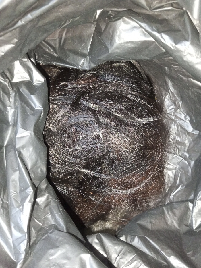 A pile of dark, tangled hair sits nestled within a crumpled black plastic bag