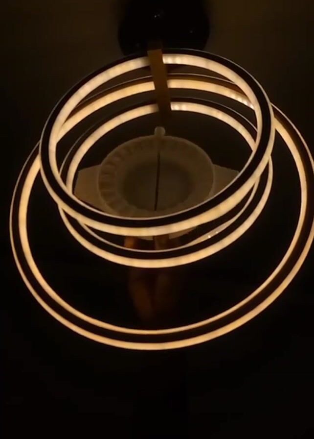 modern chandelier consisting of concentric light rings hanging from a dark ceiling fixture. The lights are primarily a warm, creamy color. A dumpling mold sits just below the chandelier’s rings, partially obscured by the lights. A hand reaches into the shot and briefly touches the dumpling mold, before pulling away. The environment is dimly lit, focusing attention on the illuminated chandelier.
