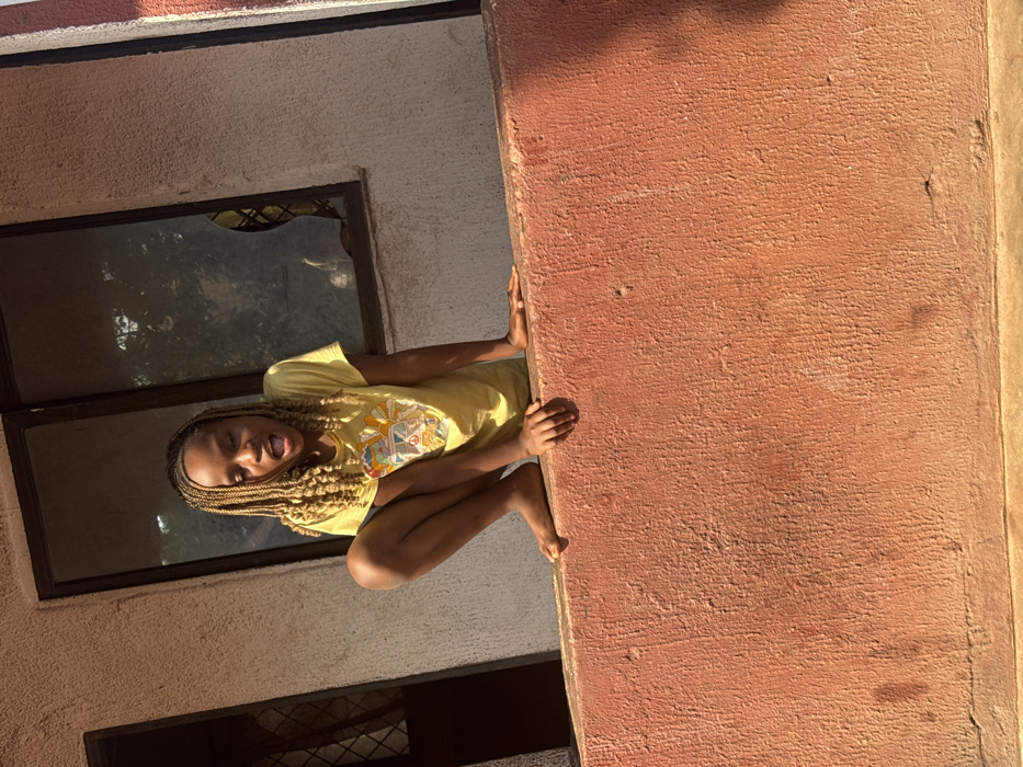 The scene, located in Aguata, Nigeria, depicts a young, dark-skinned girl with long, light brown braided hair. She is positioned in a squat on a prominent reddish-brown textured wall, facing the viewer. The girl wears a yellow short-sleeved t-shirt with a multi-colored graphic design on the front and is barefoot. Her hands are placed flat on the top surface of the wall in front of her. Her mouth is open, and her eyes are wide, directed towards the camera. Behind her is a light-colored, textured building wall featuring a dark-framed window with multiple panes; one pane on the right appears broken or distorted. A partial, dark-framed opening is visible on the far left of the background building. The environment is illuminated by natural daylight, casting some shadows.